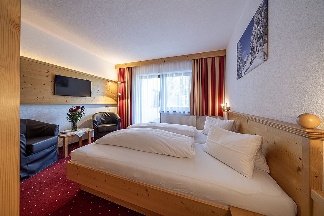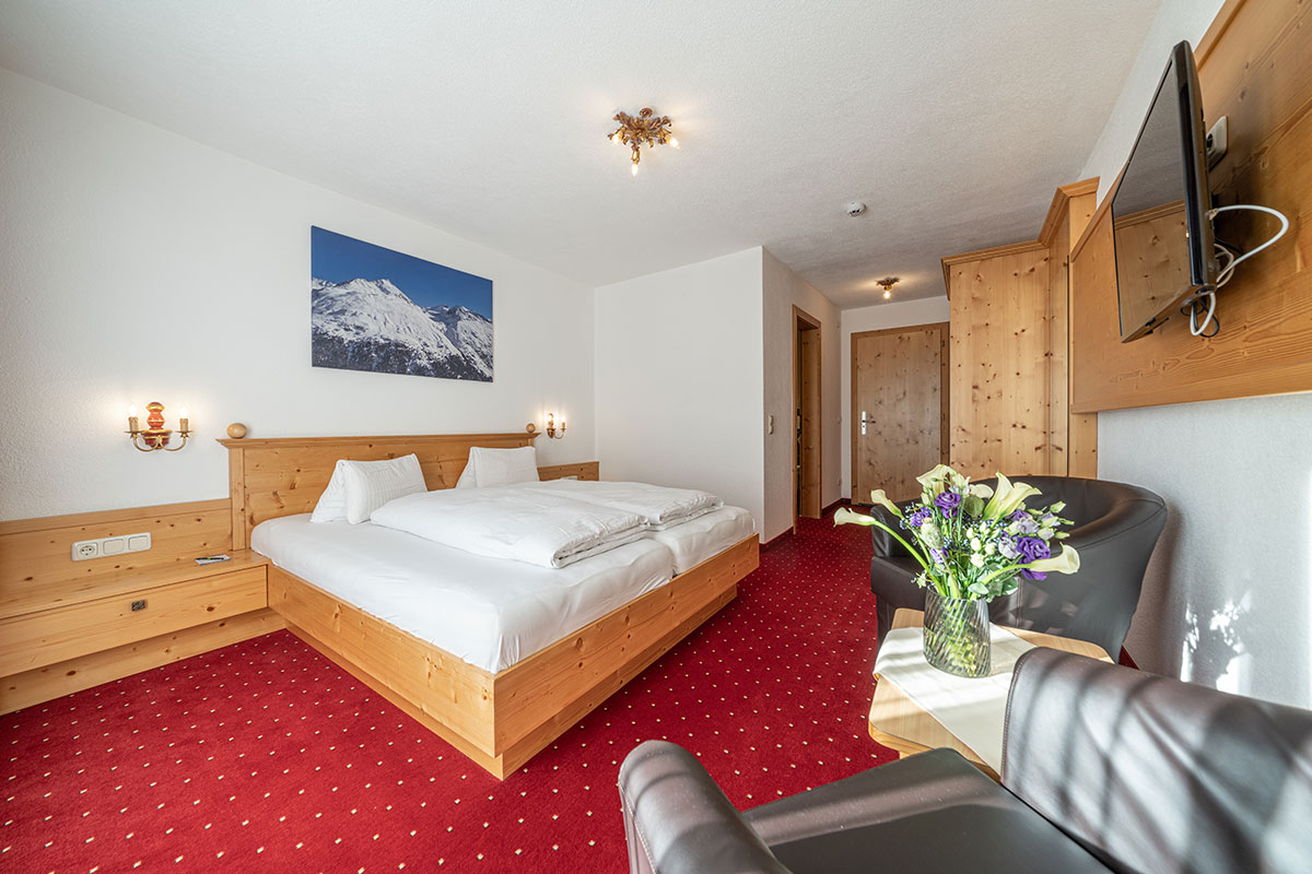 Our double room Talleitspitze is on the south side of the hotel. The room offers a double bed and a bathroom with bath or shower. Enjoy an uninterrupted view of the Ötztaler Alps from the south facing balcony.